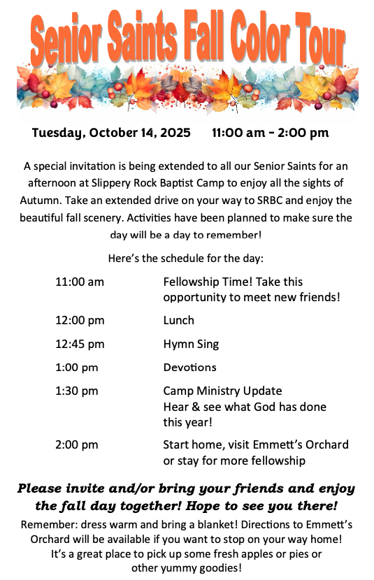 Enjoy the Fall Colors and a special Seniors’ Fellowship